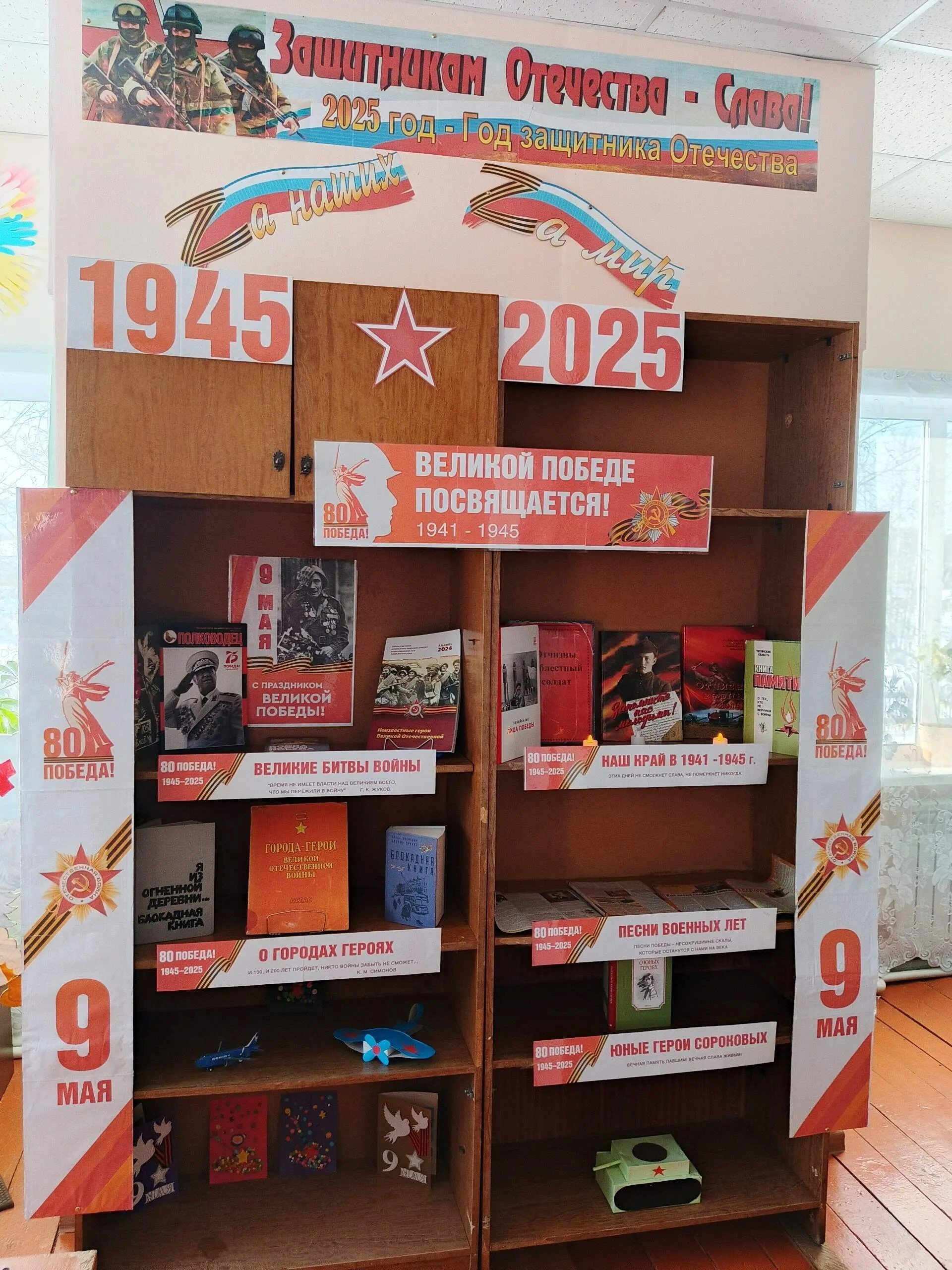 Оформлена книжная выставка-прославление «Стоит на страже Родины солдат», в которую входят разделы: «Защитники земли русской», «Страницы великого подвига», «Читать, знать, помнить», «И в книгах память о войне».