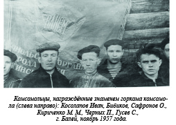 «Мне было 16 лет, когда в 1929 году приехал в Забайкалье из Западной Сибири. С того времени вся жизнь связана с Балеем. Трудное было время, но интересное. Работа под землёй была тяжёлой, она и сейчас-то у горняков не мёд, а тогда тем более. Бур да киянка, кайла да лопата – вот и вся механизация. Частенько бывало так, что не успевали обуривать действующие забои. Людей-то не хватало. И тогда наши вожаки Петя Ходырев и Коля Баранников поднимали комсомольцев. По ночам обуривали забои, откатывали руду», – вспоминал комсомолец 20-х годов Зубков Иван Георгиевич.