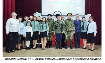 По доброй традиции всех присутствующих на концерте приветствовал подъесаул Юрий Александрович Золотуев, атаман станицы Новотроицкая. В своём выступлении он поздравил всех мужчин с праздником и отметил героизм и мужество земляков – участников специальной военной операции.