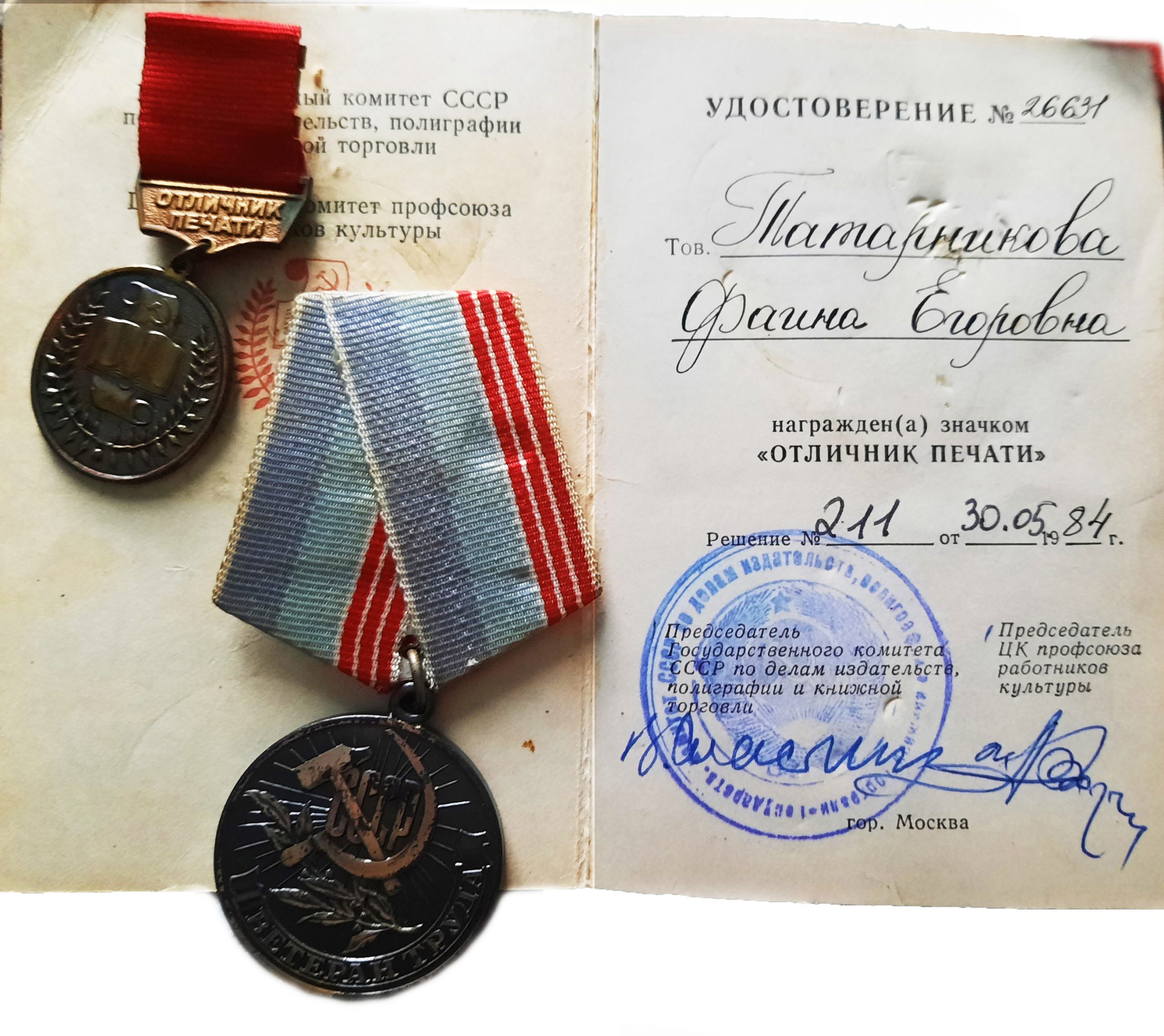 Труд Фаины Егоровны не остался незамеченным – ей было присвоено звание «Ударник коммунистического труда», а в 1984 году награждена значком «Отличник печати», множеством благодарностей, почётных грамот и ценных подарков.